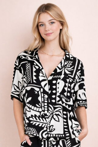 This print is so fun, pair her up with our Cami Pants. Feeling sexy do a tie in the front of the button up.